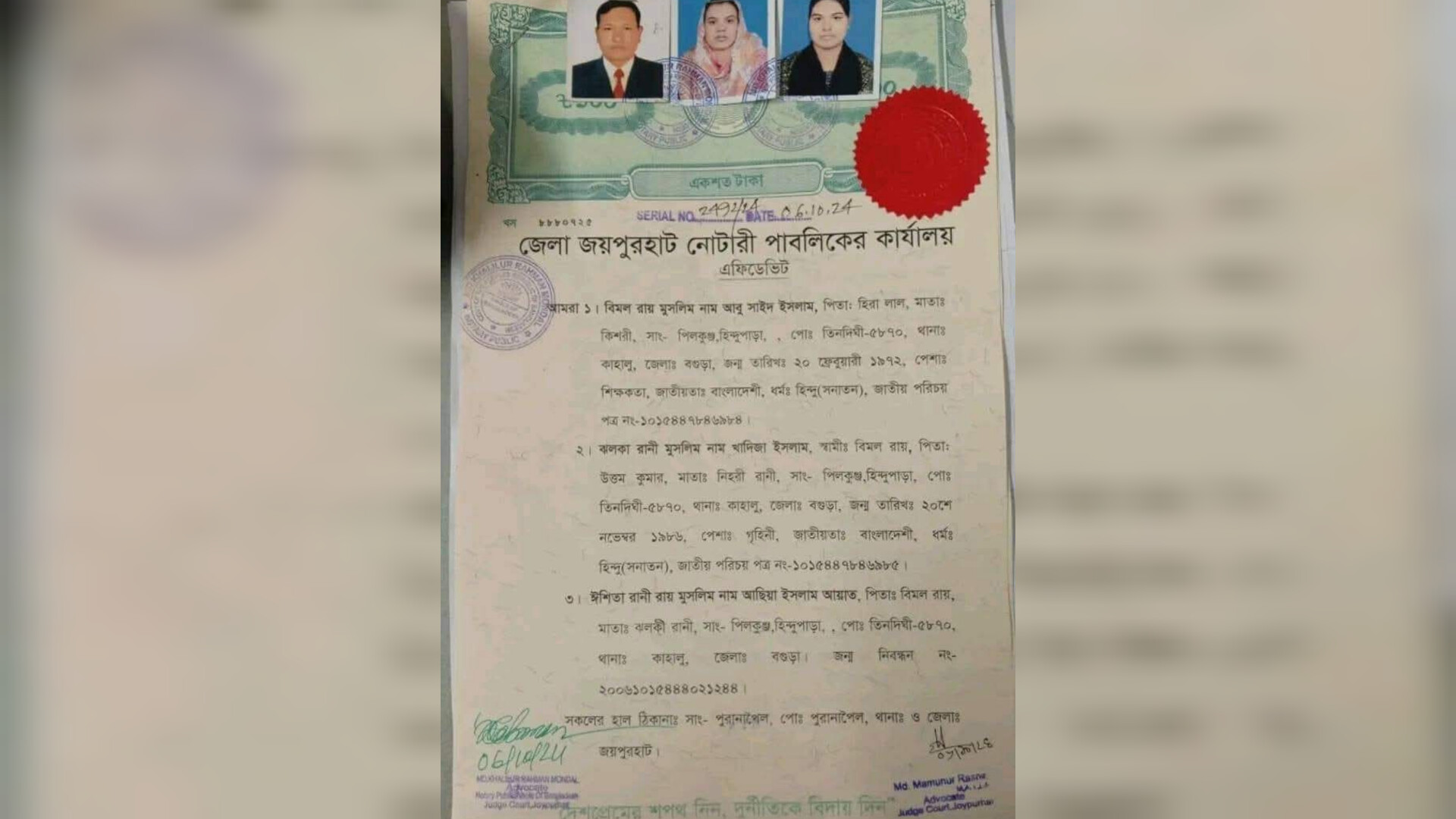বিষয়টি নিশ্চিত করে জয়পুরহাট বার এসোসিয়েশন এর আইনজীবী মামুনুর রশীদ বলেন, ‘অ্যাফিডেভিট’ এর মাধ্যমে তারা ধর্মান্তরিত হওয়ার বিষয়টি সম্পাদন করেন। পরবর্তিতে তারা ইসলাম ধর্মের ধর্মীয় আচার সম্পন্ন করেন।’