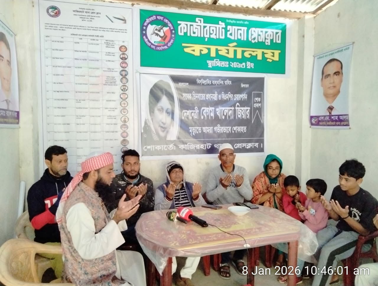 রাসেল কবির// সাবেক তিন বারের প্রধানমন্ত্রী, মাদার অফ ডেমোক্রেসি, আপসহীন দেশনেত্রী মরহুমা বেগম খালেদা জিয়ার রুহের মাগফেরাত কামনায় কাজিরহাট থানা প্রেসক্লাবের উদ্যোগে দোয়া ও মোনাজাত অনুষ্ঠিত হয়েছে । ৮ ই জানুয়ারী ২০২৬ রোজ বৃহস্পতিবার সকাল ১০-৩০ মিনিটে কাজিরহাট থানা প্রেস ক্লাব অস্থায়ী ভবনে।