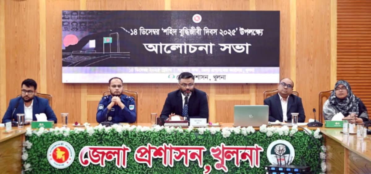 আজ (রবিবার) খুলনা জেলা প্রশাসকের সম্মেলনকক্ষে শহিদ বুদ্ধিজীবী দিবস ২০২৫ উপলক্ষ্যে আলোচনা সভা অনুষ্ঠিত হয়। অনুষ্ঠানে সভাপতিত্ব করেন জেলা প্রশাসক আ. স. ম. জামশেদ খোন্দকার। মহান মুক্তিযুদ্ধে অবদান রাখা সকল শহিদদের স্মরণে এক মিনিট নিরবতা পালন করা হয়।