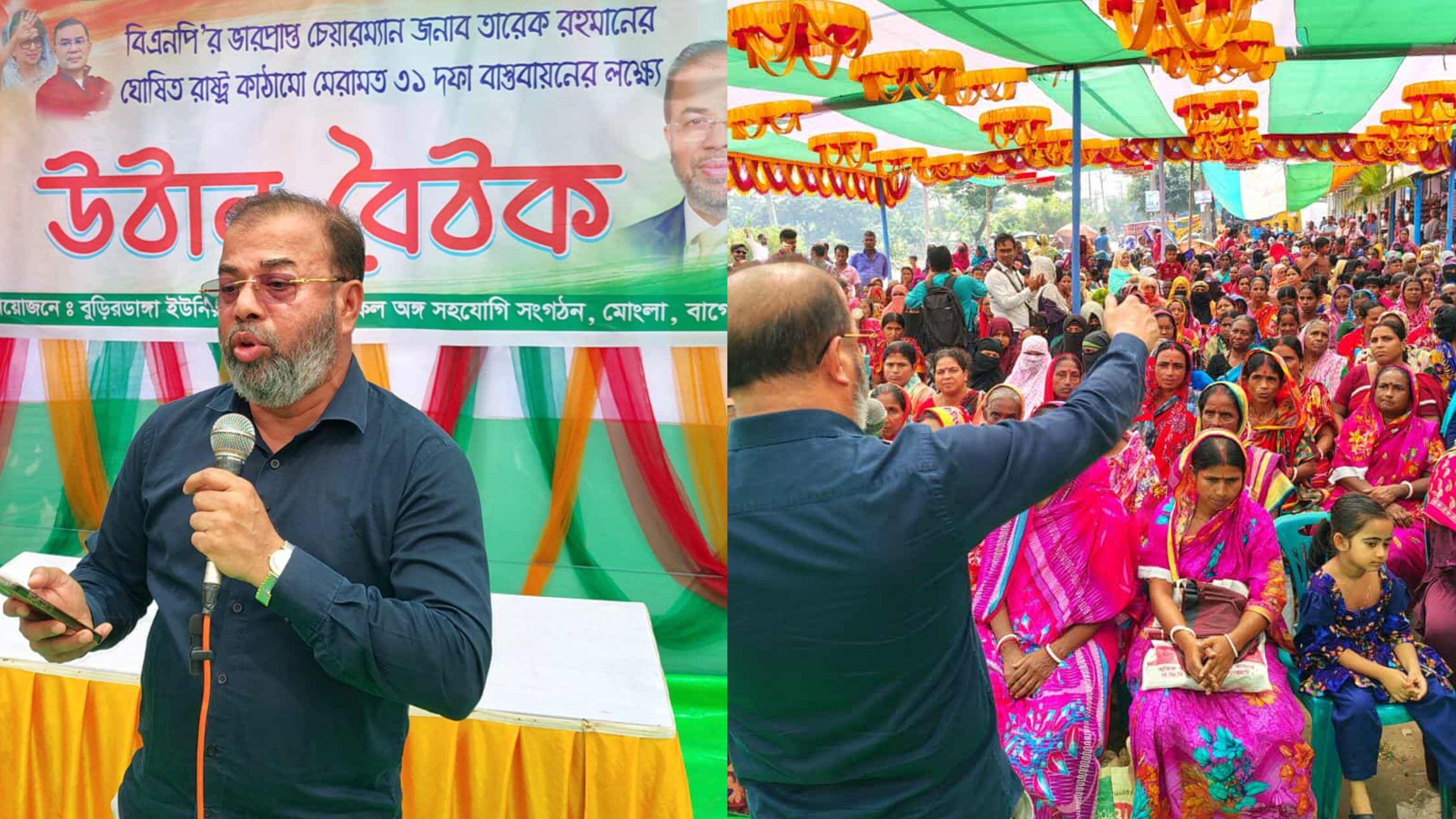 বিএনপির ভারপ্রাপ্ত চেয়ারম্যান তারেক রহমান ঘোষিত রাষ্ট্র কাঠামো মেরামতে ৩১ দফা বাস্তবায়নের লক্ষ্যে মোংলায় বিএনপির উঠান বৈঠক অনুষ্ঠিত হয়েছে। বৃহস্পতিবার (১৬ অক্টোবর) সকাল ১০ টায় দিগরাজ এলাকায় অনুষ্ঠিত এ উঠান বৈঠক অনুষ্ঠিত হয়। এ সময় প্রধান অতিথির বক্তব্য দেন বাগেরহাট জেলা বিএনপির যুগ্ম আহবায়ক ও মোংলা-রামপাল-ফকিরহাট সংসদীয় ২ আসনের মনোনয়ন প্রত্যাশী লায়ন ডক্টর শেখ ফরিদুল ইসলাম। তিনি উপস্থিত নারী-পুরুষের মাঝে ৩১ দফার লিফলেট বিতরণ করেন এবং সকলের মাঝে তুলে ধরেন তারেক রহমানের ৩১ দফা সমূহ।