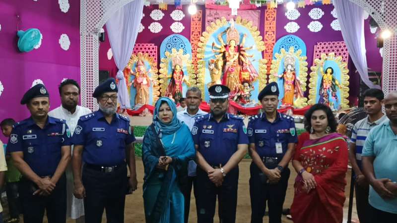সনাতন ধর্মাবলম্বীদের প্রধান উৎসব শারদীয় দুর্গাপূজা উপলক্ষে সুনামগঞ্জের দোয়ারাবাজার উপজেলার বিভিন্ন পূজামণ্ডপ পরিদর্শন করেছেন সিলেট রেঞ্জের ডিআইজি মো. মুশফেকুর রহমান।মঙ্গলবার (৩০ সেপ্টেম্বর) সন্ধ্যায় তিনি দোয়ারাবাজারের সার্বজনীন পূজামণ্ডপ ও বিদ্যাজননী পূজামণ্ডপ পরিদর্শন করেন। এরপর তিনি উপজেলার আরও কয়েকটি পূজামণ্ডপ পরিদর্শন করেন। ডিআইজি মুশফেকুর রহমান সনাতন ধর্মাবলম্বী ও মণ্ডপ কমিটির নেতৃবৃন্দের সঙ্গে শুভেচ্ছা বিনিময় করেন এবং পূজা মণ্ডপগুলোর নিরাপত্তা ব্যবস্থা তদারকি করেন। তিনি সার্বিক আইন-শৃঙ্খলা ও নিরাপত্তা পরিস্থিতি পর্যবেক্ষণ করে প্রয়োজনীয় দিকনির্দেশনা প্রদান করেন। এর আগে, ডিআইজি সিলেট রেঞ্জের পৌঁছালে তাকে স্বাগত জানান সুনামগঞ্জ জেলার পুলিশ সুপার মো. তোফায়েল আহমদ, এসপি সার্কেল মো. আ. কাদের এবং দোয়ারাবাজার থানার ভারপ্রাপ্ত কর্মকর্তা (ওসি) জাহিদুল হক। এসময় রেঞ্জ অফিস, জেলা পুলিশ এবং থানা-পুলিশের কর্মকর্তারা এবং দোয়ারাবাজার উপজেলা সাংবাদিকরা উপস্থিত ছিলেন।