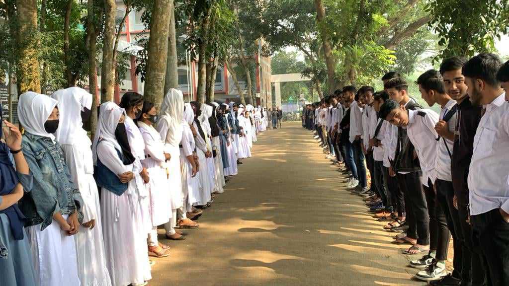 সোমবার (১১ ডিসেম্বর) বেলা ১১ টায় সরকারি নগরকান্দা মহাবিদ্যালয় ক্যাম্পাসে ঘন্টা ব্যাপী মানববন্ধনের আয়োজন করে কলেজের সাধারণ শিক্ষার্থীরা।