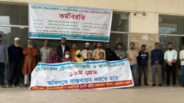 বাংলাদেশ মেডিকেল টেকনোলজিস্ট অ্যাসোসিয়েশন (বিএমটিএ) নেত্রকোনা জেলা শাখার নেতৃবৃন্দ। বৈষম্য নিরসন করে দশম গ্রেড বাস্তবায়নের দাবিতে আজ সকাল ৮টা বেলা ১২টা পর্যন্ত সকল স্বাস্থ্য বিভাগীয় পরীক্ষা-নিরীক্ষা বন্ধ রেখে কেন্দ্রীয় কর্মসূচির অংশ হিসেবে এই কর্মবিরতি পালন করেছেন তারা।