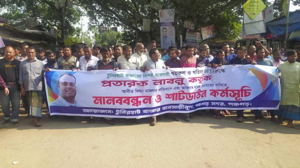 পঞ্চগড়ে দুই ব্যবসায়ীর বিরুদ্ধে মিথ্যা মামলা দায়েরের অভিযোগে ব্যবসায়ীদের বিক্ষোভ মিছিল ও সমাবেশ।