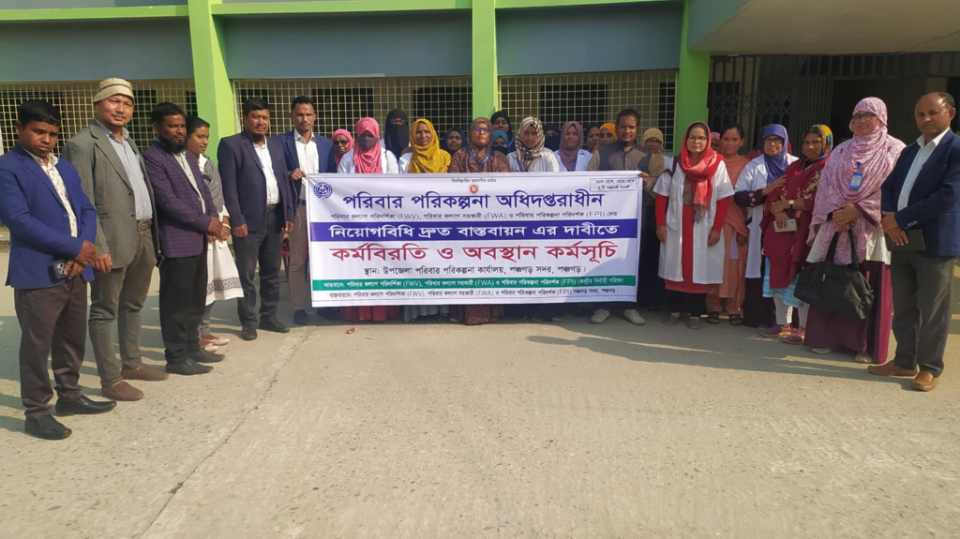 পঞ্চগড়ে নিয়োগবিধি ও নীতিমালা প্রনয়নের দাবীতে পঞ্চগড়ে পরিবার পরিকল্পনা কর্মচারী পরিদর্শক এবং পরিবার কল্যান সহকারীরা অবস্থান কর্মসূচি শুরু করেছে। মঙ্গলবার সকাল থেকে পরিবার পরিকল্পনা মাঠ কর্মচারী এসোসিয়েশনের আহবানে পঞ্চগড় সদর উপজেলা চত্তরে এই কর্মসূচি শুরু করেছেন । অবস্থান কর্মসূচিতে পরিবার কল্যান পরিদর্শিকা এসোসিয়েশন, পরিবার কল্যান সহকারী সমিতি, এবং পরিবার পরিকল্পনা পরিদর্শক সমিতির পঞ্চগড় শাখার সদস্যরা এই কর্মসূচি পালন করেন। আগামি ১১ ডিসেম্বর পর্যন্ত এই কর্মসূচি পালন করার ঘোষনা দিয়েছেন । সদর উপজেলার ১০টি ইউনিয়ন থেকে পরিবার কল্যান সহকারী, পরিদর্শক এবং পরিদর্শিকারা তাদের কর্মস্থল ছেড়ে উপজেলা চত্তরে চেয়ার নিয়ে বসে আছেন সেই সাথে তাদের দাবী দাওয়া নিয়ে বক্তব্য দিচ্ছেন। এসময় এক দফা এক দাবী নিয়োগবিধি নিয়োগবিধি বলে স্লোগান দেন অবস্থানকারীরা। পরিবার পরিকল্পনা সহকারী মুক্তা বেগম এবং পরিদর্শক আহসান হাবিব বক্তব্য দেন। বক্তাদের দাবী ২৬ বছর থেকে পরিবার পরিকল্পনা চাকুরী করলেও তিনটি পদে কর্মচারীদের নিয়োগ বিধি নীতিমালা নেই এজন্য একই পদে চাকুরি করছেন কোন পদন্নোতি নেই গ্রেডও পরিবর্তন হয়না অথচ রাজস্ব খাতে অন্যান্য দপ্তরে চাকরি করা নারী পুরুষদের সহজেই পদোন্নতি গ্রেড পরিবর্তন হয় এজন্য আমরা বৈষম্যের শিকার হয়েছি। পরিবার পরিকল্পনা পরিদর্শক আহসান হাবিব বলেন দীর্ঘ ২৬ বছর থেকে মাঠ পর্যায়ে যারা চাকুরি করছে আমাদের কোন নিয়োগবিধি নেই। এজন্য যে পদে চাকুরিতে প্রবেশ করি সেই পদেই অবসর নিতে হয়। আমরা এর আগেও আন্দোলন করেছি মানববন্ধন সংবাদ সম্মেলন করেছি কিন্ত কতৃপক্ষ কোন কর্নপাত করেনি। আমাদের দাবী আদায় না হলে আমরা কঠোর কর্মসূচি পালন করবো। দাবী আদায় না হওয়া পর্যন্ত আমরা কর্মস্থলে ফিরবোনা। অতি দ্রুত আমাদের নিয়োগ বিধি চুড়ান্ত করা না হলে কঠোর আন্দোলন গড়ে তোলার ঘোষনা দেন। পরিবার কল্যান সহকারী আমাদের দাবী একটাই ২৬ বছর থেকে কোন নিয়োগ বিধি নেই আমাদের পরিবার পরিকল্পনা মাঠ পর্যায়ের কর্মচারিরা বৈষম্যের শিকার হচ্ছি। সামনে আমাদের সেবা সপ্তাহের কার্যক্রম বর্জন করবো। প্রধান উপদেস্টার কাছে আমাদের দাবী আামাদের বৈষম্যমুক্ত করবেন। কারন বর্তমান বাংলাদেশ বৈষম্যমুক্ত বাংলাদেশ তাই আামাদের দাবী মেনে নিবেন অন্যথায় আমরা কর্মস্থলে ফিরবোনা। অবস্থান কর্মসূচিতে জেলা ৫০ জনের বেশি পরিবার কল্যান সহকারী পরিদর্শক পরিদর্শিকা অংশ নেন। প্রতিদিন অফিস চলাকালিন সময়ে আগামি ১১ ডিসেম্বর পর্যন্ত অবস্থান কর্মসূচি পালন করবেন কর্মচারীরা।