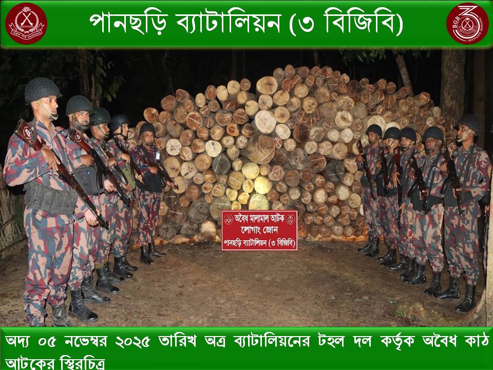 পানছড়িতে বিশেষ অভিযান চালিয়ে বিপুল পরিমাণ অবৈধ কাঠ আটক করেছে পানছড়ি ব্যাটালিয়ন (৩ বিজিবি)। ৫ নভেম্বর বুধবার দুপুর ১টার দিকে গোপন সংবাদের ভিত্তিতে ব্যাটালিয়ন সদর থেকে প্রায় ৩ কিলোমিটার দক্ষিণে নালকাটা এলাকায় এ অভিযান পরিচালনা করা হয়।