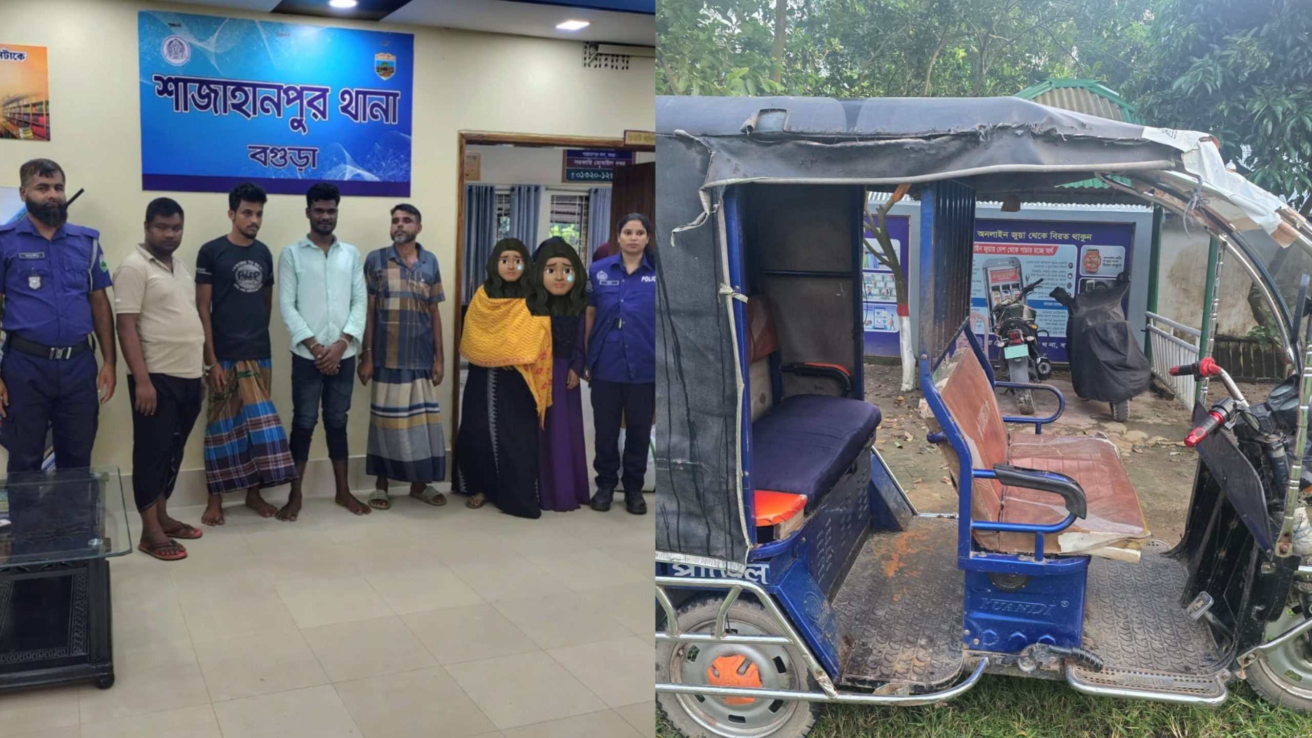 স্ত্রী,দুগ্ধপোষ্য শিশু ও শালিকা কে যাত্রী সাজিয়ে অভিনব কায়দায় অটোরিকশা ও ইজিবাইক চুরি ও ছিনতাই চক্রের ৬ জন সক্রিয় সদস্য বগুড়া জেলার শাজাহানপুর থানা ও শেরপুর থানা পুলিশের যৌথ অভিযানে গ্রেফতার,চুরি যাওয়া অটো ইজিবাইক উদ্ধার এবং গ্রেপ্তারকৃতদের বিজ্ঞ আদালতে সোপর্দ করা হয়েছে।