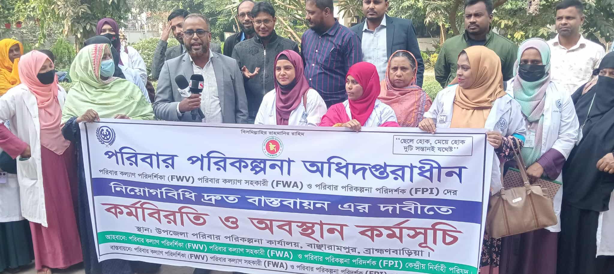 মঙ্গলবার দুপুরে উপজেলা পরিবার পরিকল্পনা কার্যালয়ের সামনে উপজেলার পরিবার কল্যাণ পরিদর্শিকা, পরিবার কল্যাণ সহকারী ও পরিবার পরিকল্পনা পরিদর্শকদের কর্মবিরতি ও অবস্থান কর্মসূচি অনুষ্ঠিত হয়।