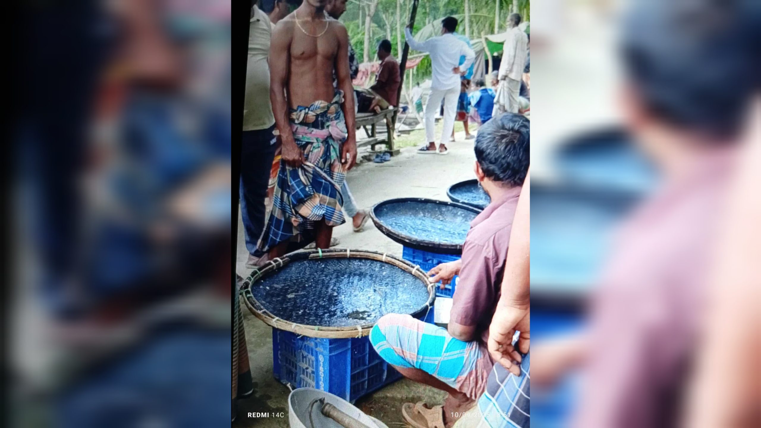 মেহেন্দিগঞ্জের নলবুনিয়া অভিনব কায়দায় মা ইলিশ বিক্রি চলছে।