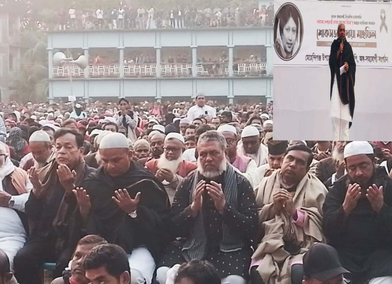 রাসেল কবির// বিএনপির চেয়ারপারসন, সাবেক প্রধানমন্ত্রী, আপোষহীন নেত্রী, মরহুমা বেগম খালেদা জিয়ার রুহের মাগফিরাত কামনায় মেহেন্দিগঞ্জ উপজেলা ও পৌর বিএনপির উদ্যোগে দোয়া ও মোনাজাত অনুষ্ঠিত হয়েছে।বুধবার বিকেলে সরকারি পাতারহাট রসিক চন্দ্র মহাবিদ্যালয়ের মাঠে দোয়া অনুষ্ঠানটি জনসমুদ্রে পরিনত হয়। দোয়া অনুষ্ঠানে প্রধান অতিথি হিসেবে উপস্থিত ছিলেন কেন্দ্রীয় স্বেচ্ছাসেবক দলের সাধারণ সম্পাদক,বরিশাল-৪ আসনে বিএনপির মনোনীত(ধানের শীষ) প্রার্থী রাজিব আহসান। এসময় অন্যান্যের মধ্যে উপস্থিত ছিলেন, উপজেলা বিএনপির আহবায়ক গিয়াস উদ্দিন দিপেন, উপজেলা বিএনপির সাবেক সভাপতি সৈয়দ রফিকুল ইসলাম লাবু, উপজেলা বিএনপির সদস্য সচিব সিহাব আহামেদ সেলিম, সিনিয়র যুগ্ম আহবায়ক আসাদুজ্জামান মুক্তা, বরিশাল উত্তর জেলা যুবদলের আহবায়ক সালাউদ্দিন পিপলু, পৌর বিএনপির সদস্য সচিব রিয়াজ উদ্দিন চৌধুরী দিনু মিয়া, পৌর বিএনপির সাবেক সভাপতি জিয়া উদ্দিন সুজন, উপজেলা যুবদলের আহবায়ক সৈয়দ নাঈম ইসলাম তুহিন, সদস্য সচিব মাজহারুল ইসলাম পারভেজ, পৌর যুবদলের আহবায়ক মামুন মিয়াজি, সিনিয়র যুগ্ম আহবায়ক সিরাজ খান, উপজেলা স্বেচ্ছাসেবক দলের আহবায়ক ফখরুল ইসলাম সোহেল, সদস্য সচিব মাসুদ রানা, পৌর স্বেচ্ছাসেবক দলের আহবায়ক সিপন মিয়া, সদস্য সচিব আমিনুল ইসলাম রবীন, উপজেলা ছাত্রদলের আহবায়ক শাহাদাৎ হোসেন সোহাগ সহ বিএনপি ও সহযোগী সংগঠনের নেতৃবৃন্দ।