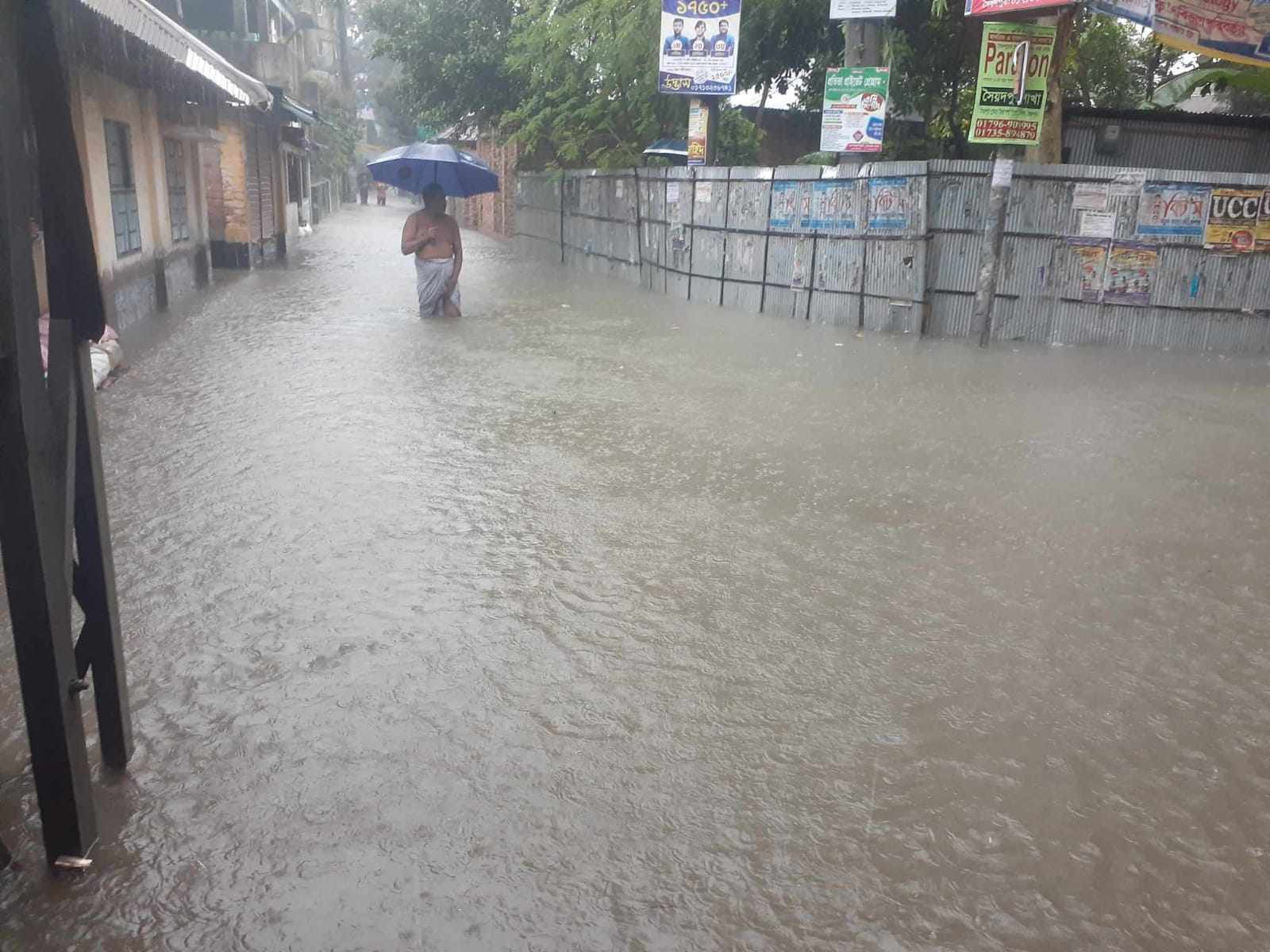গত বৃহস্পতিবার থেকে শুরু হয়েছে বৃষ্টি। সেদিন থেমে থেমে হলেও শুক্রবার সকাল থেকে লাগাতার চলছে। শনিবার রাত থেকে রবিবার দুপুর পর্যন্ত তুমুল বর্ষণে রেকর্ড পরিমাণ বৃষ্টিপাত হয়েছে। শহরের প্রাণকেন্দ্র শহীদ ডা. জিকরুল হক সড়ক, শহীদ ডা. সামসুল হক সড়ক, পৌরসভা সড়কসহ পৌর এলাকার বাঁশবাড়ী, মিস্ত্রীপাড়া, হাতিখানা, নিচু কলোনী, মুন্সিপাড়া, কয়ানিজপাড়া, গোলাহাট, নিয়ামতপুর জুম্মাপাড়া, আতিয়ার কলোনী, কাজিপাড়া, নতুন বাবুপাড়ার রাস্তাগুলো পানির নিচে।
