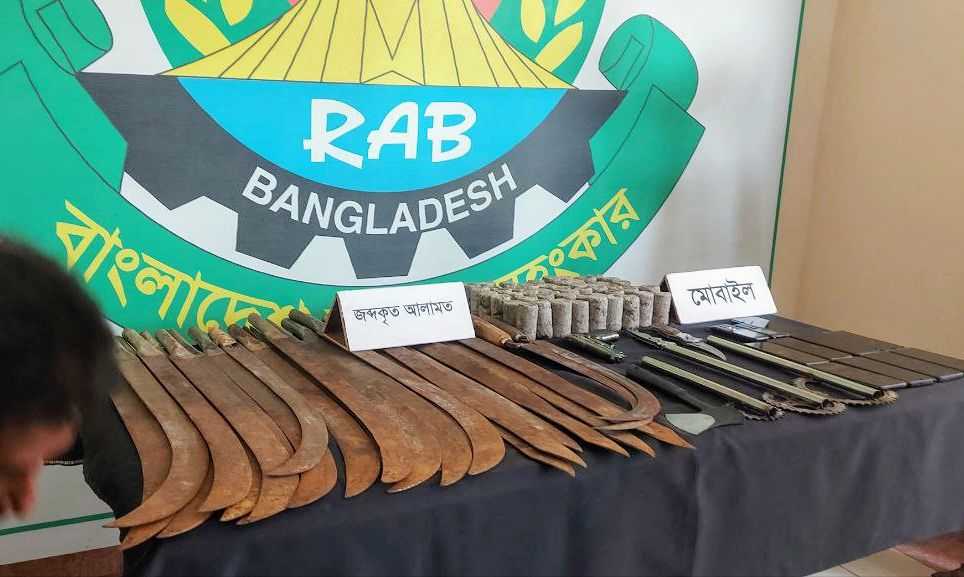 গ্রেপ্তারকৃত আসামীদের কাছ থেকে ধারালো হাসুয়া ১৮টি, ধারালো তলোয়ার ৭টি, চাকু ২টি, কাটার হাতল ৩টি, চাইনিজ কুড়াল ১টি, সিমেন্টের ব্লক- ৫৩টি, খেলনা পিস্তল ১টি, মোটরসাইকেল ৩টি ও ১২টি মোবাইল ফোন উদ্ধার করা হয়।