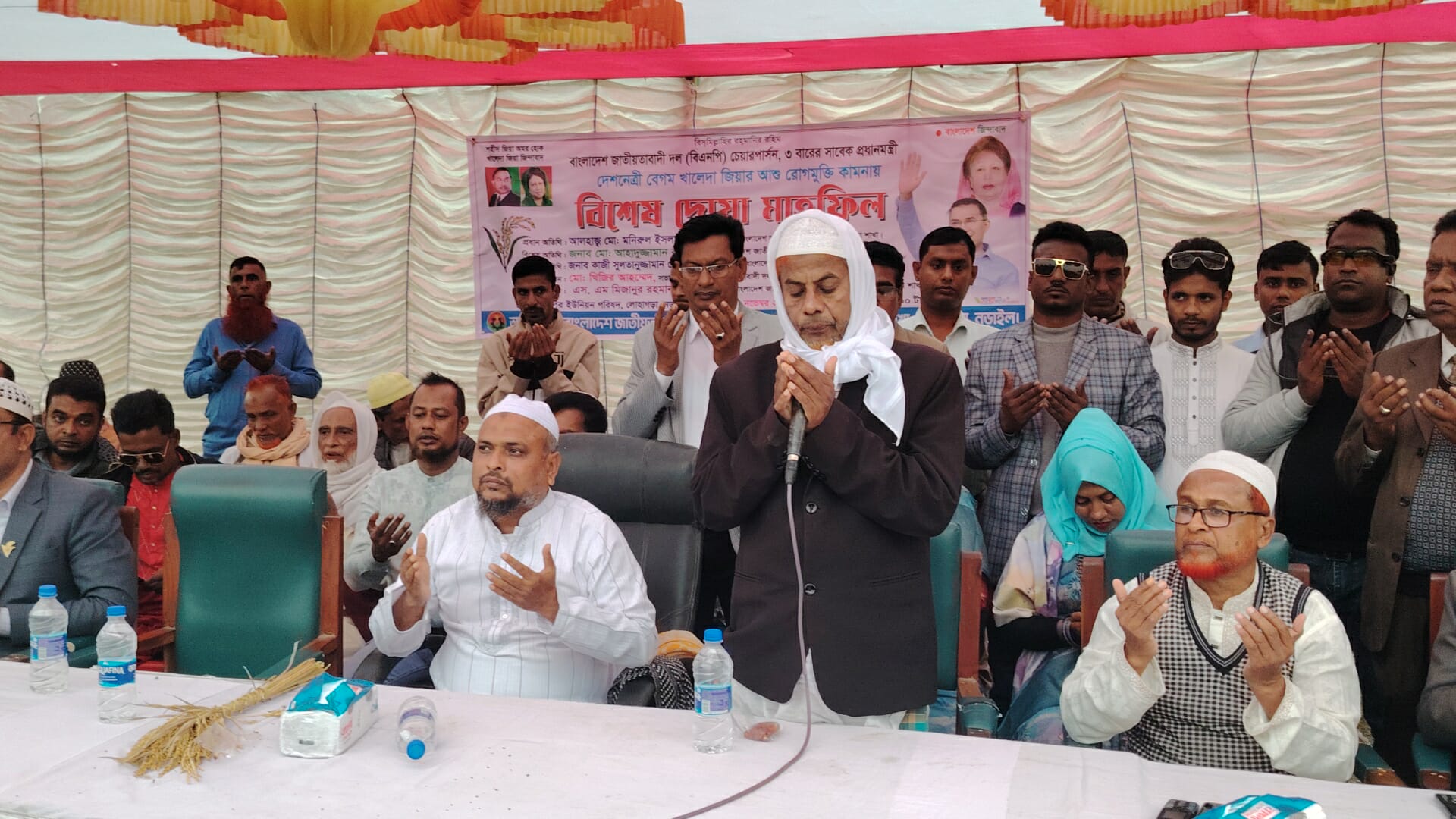 দোয়া মাহফিলে প্রধান অতিথি নড়াইল জেলার বিএনপির সাধারণ সম্পাদক মোঃ মনিরুল ইসলাম বলেন। আমাদের নেত্রী গনতন্ত্রের মা,আপোষহীন নেত্রী, তিনি অন্যায়ের সাথে আপোষ করেন নাই। তিনি জীবন মৃত্যুর সন্ধিক্ষণে বাংলাদেশের এভারকেয়ার হাসপাতালে চিকিৎসাধীন।উনার স্বাস্থ্য একটু উন্নতি হলে উন্নত চিকিৎসার জন্য দেশের বাইরে নেওয়া হবে। আমরা আজ উনার আশু রোগমুক্তির জন্য মহান আল্লার কাছে দোয়া করবো। আল্লা যেন আমাদের নেত্রী বেগম খালেদা জিয়া সুস্থতা দান করেন। “আমিন”
