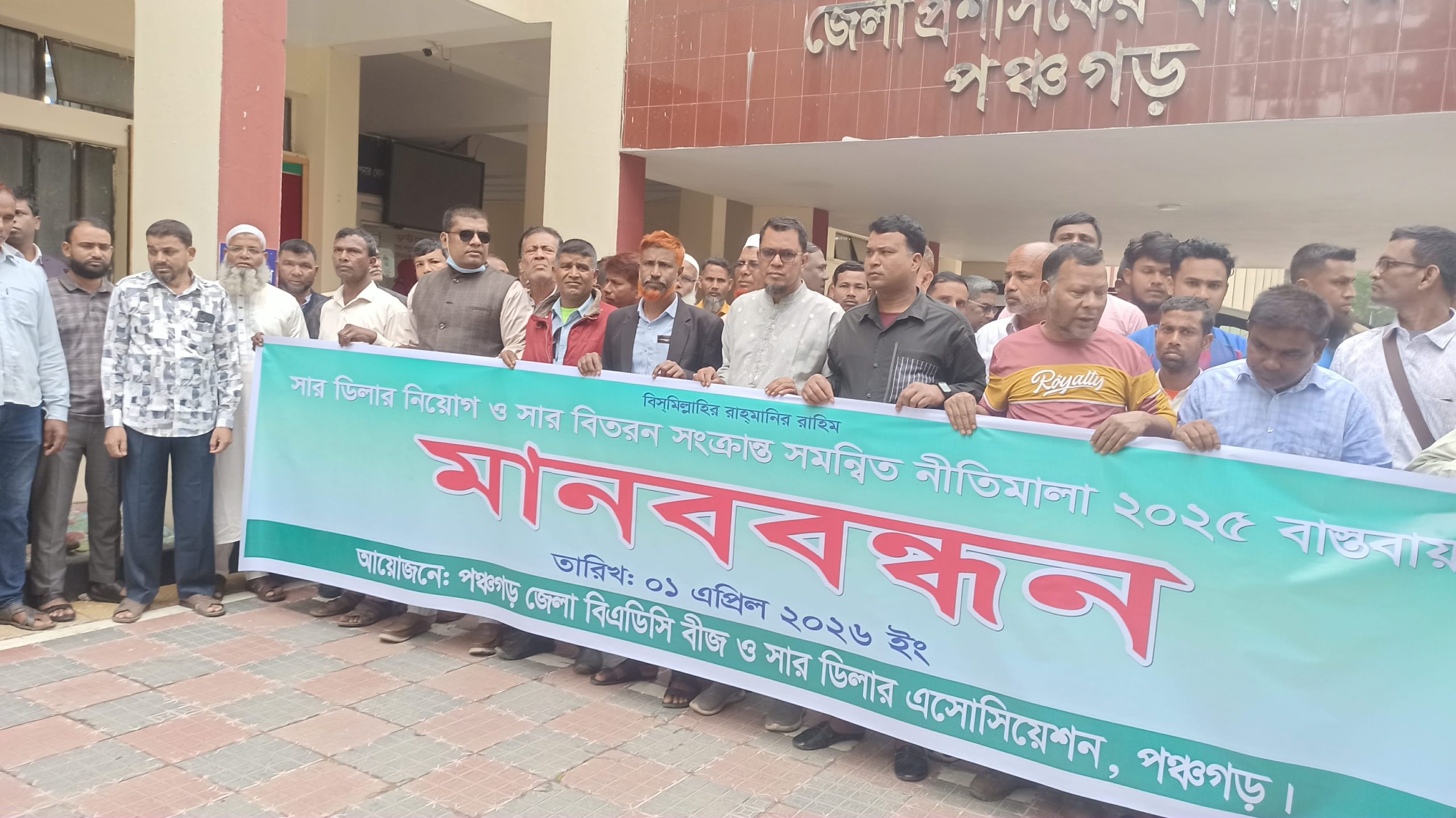 সার ডিলার নিয়োগ ও সার বিতরন সংক্রান্ত সমন্বিত নীতিমালা বাস্তবায়নের দাবীতে পঞ্চগড়ে মানববন্ধন করেছে বিএডিসি বীজ ও সার ডিলার এসোসিয়েশন। বুধবার (০১এপ্রিল) দুপুরে পঞ্চগড় জেলা প্রশাসকের কার্যালযের সামনে পঞ্চগড় এসোসিয়েশনের আয়োজনে ঘন্টা ব্যাপি মানববন্ধন করে তারা।