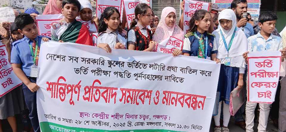 সরকারি স্কুলে ভর্তি প্রক্রিয়ায় লটারির পরিবর্তে পরীক্ষার মাধ্যমে মেধা যাচাই করে ভর্তির দাবিতে পঞ্চগড়ে মানববন্ধন অনুষ্ঠিত হয়েছে। মঙ্গলবার দুপুরে শহরের কেন্দ্রীয় শহীদ মিনার চত্বরে ঢাকা–বাংলাবান্ধা মহাসড়কে ঘণ্টাব্যাপী এই মানববন্ধনে অংশ নেন বিভিন্ন কিন্ডারগার্টেনের শিক্ষক, শিক্ষার্থী ও অভিভাবকরা।