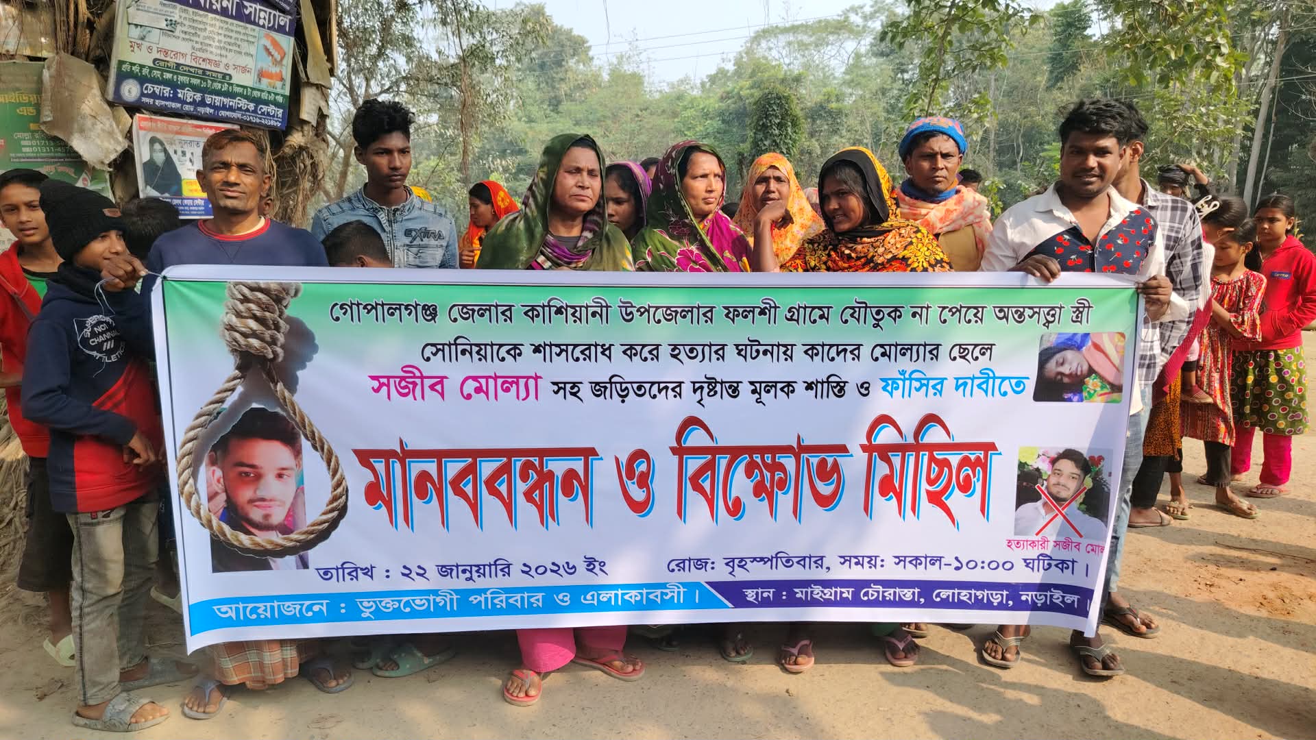 বৃহস্পতিবার (২২ জানুয়ারি) বেলা ১১টায় লক্ষীপাশা মহাজন সড়কের মাইগ্রাম চৌরাস্তায় এ মানববন্ধন অনুষ্ঠিত হয়েছে। মানববন্ধনে স্বজন সহ এলাকার দুই শতাধিক নারী পুরুষ অংশগ্রহন করেন। মানববন্ধন শেষে তারা প্রতিবাদ মিছিল করেন। মানববন্ধনে বক্তারা বলেন, সোনিয়া হত্যার বিচার চাই। সজিবের ফাসি চাই। বক্তব্যে স্থানীয় বাসিন্দা বাবুল আহমেদ বাবু বলেন, মাত্র ৩ মাস আগে সোনিয়াকে বিবাহ দেওয়া হয় গোপালগঞ্জ জেলার কাশিয়ানি উপজেলার ফলসী গ্রামের কাদের মোল্যার ছেলে সজিবের সাথে। বিয়ের সময় মেয়ের সুখের কথা চিন্তা করে ৫ লাখ টাকা ও স্বর্ণালংকার প্রদান করা হয়।