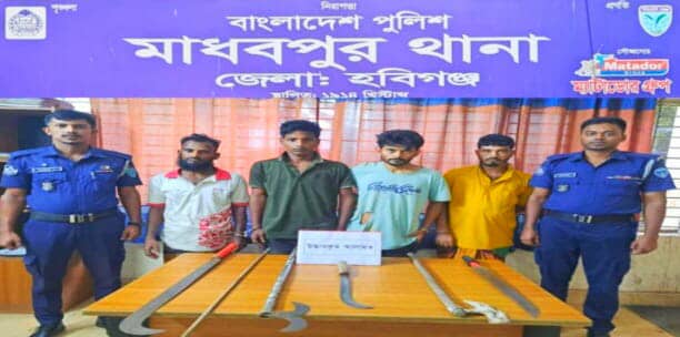 হবিগঞ্জ জেলার পুলিশ সুপার এ. এন. এম. সাজেদুর রহমানের নির্দেশনা ও তত্ত্বাবধানে এবং মাধবপুর থানার অফিসার ইনচার্জ (ওসি) মোঃ সহিদ উল্লাহর নেতৃত্বে গোপন সংবাদের ভিত্তিতে এক বিশেষ অভিযান পরিচালনা করে দেশীয় অস্ত্রসহ চারজনকে গ্রেফতার করেছে মাধবপুর থানা পুলিশ।