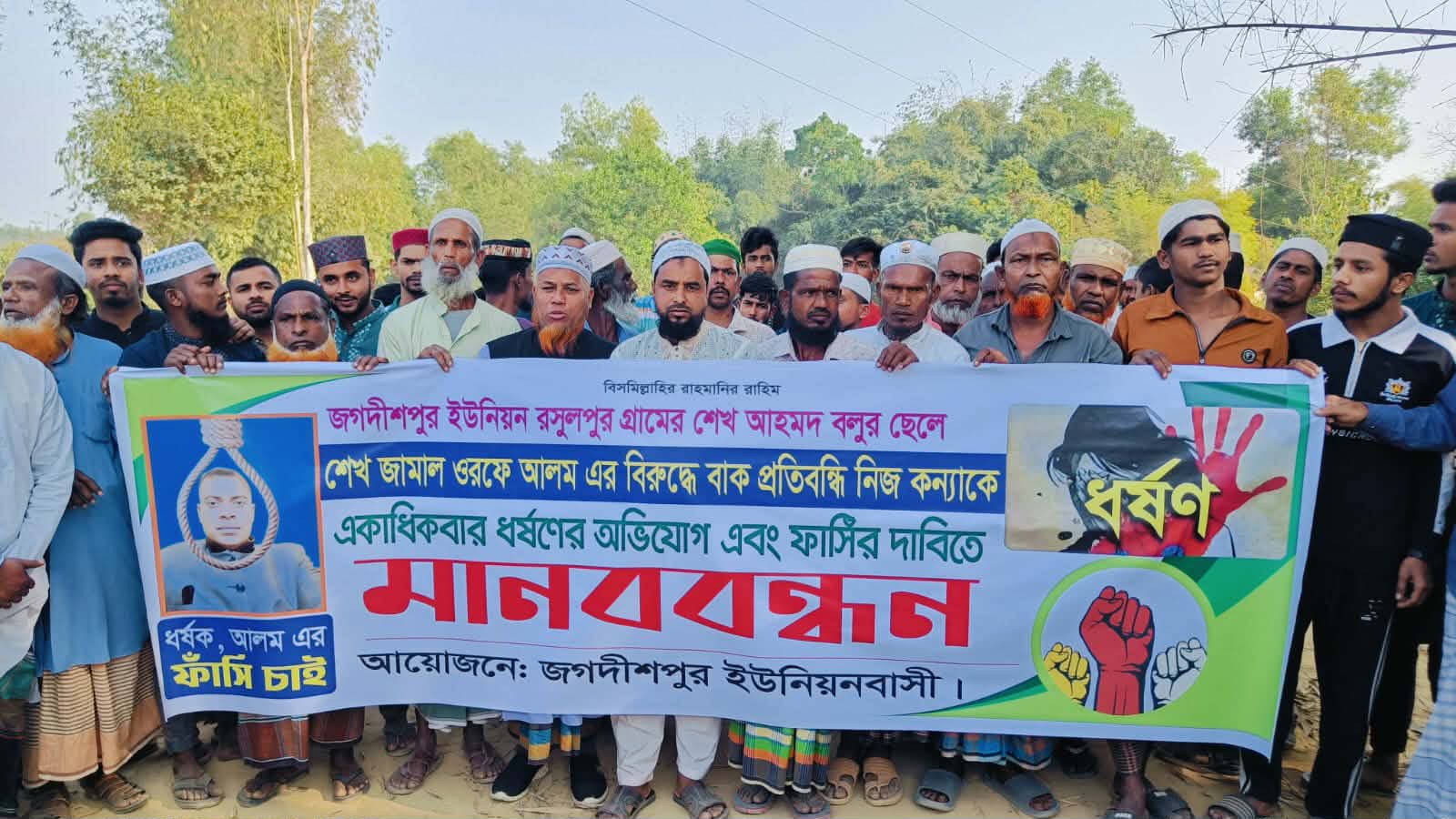 শুক্রবার (২৩ জানুয়ারি) জুম্মার নামাজের পর রসুলপুর গ্রামে অভিযুক্তের দৃষ্টান্তমূলক শাস্তির দাবিতে জগদীশপুর ইউনিয়নবাসীর উদ্যোগে মানববন্ধন অনুষ্ঠিত হয়।