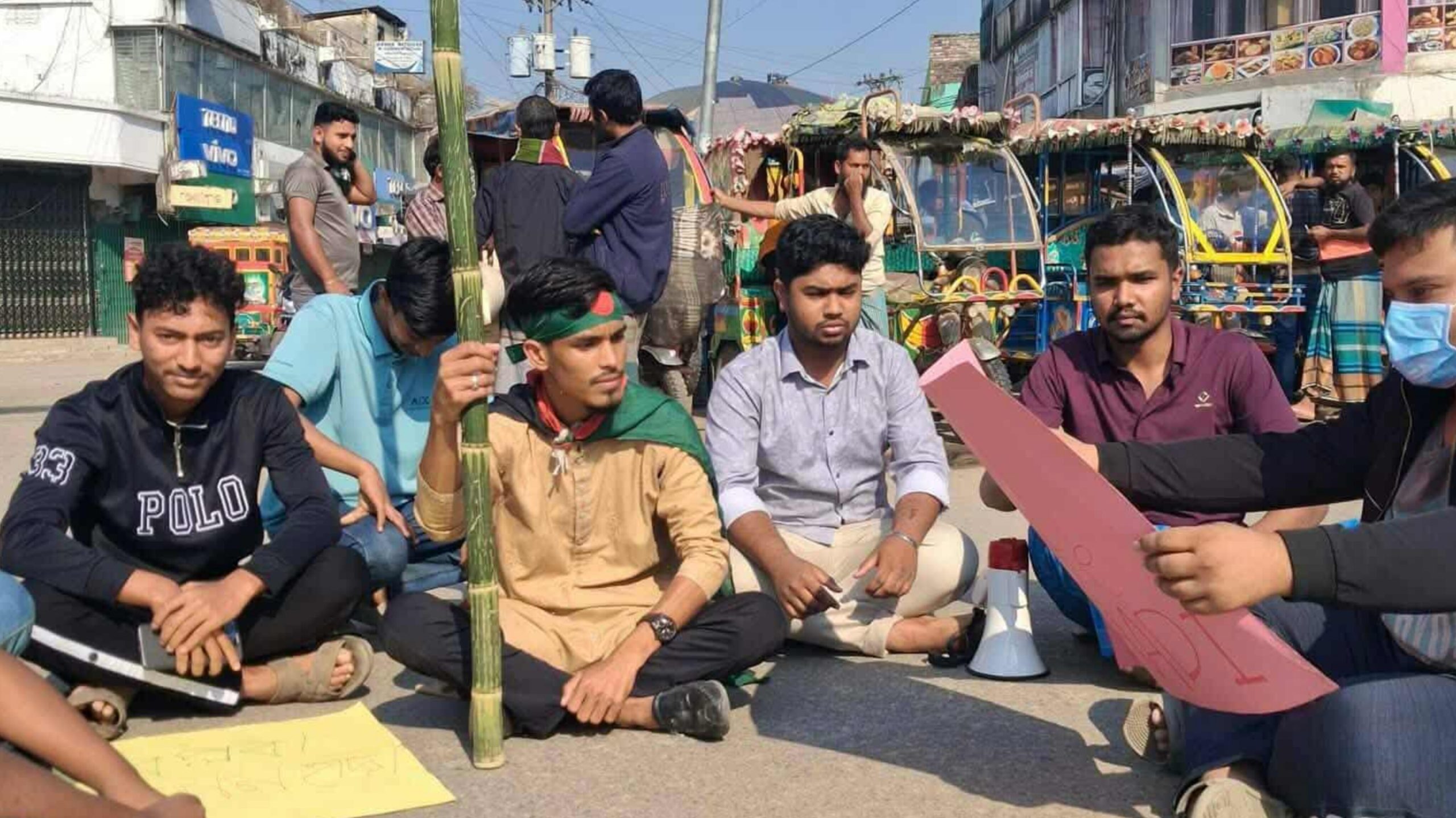 শুক্রবার সকাল ১০ টায় থেকে প্রায় দুই ঘন্টা ব্যাপী মাদারগঞ্জের বালিজুড়ী বাজার চৌ রাস্তার মোড়ে প্লেকার্ড, জাতীয় পতাকা ও হাতে লাঠি নিয়ে অবস্থান কয়েকজন ছাত্র-জনতা।