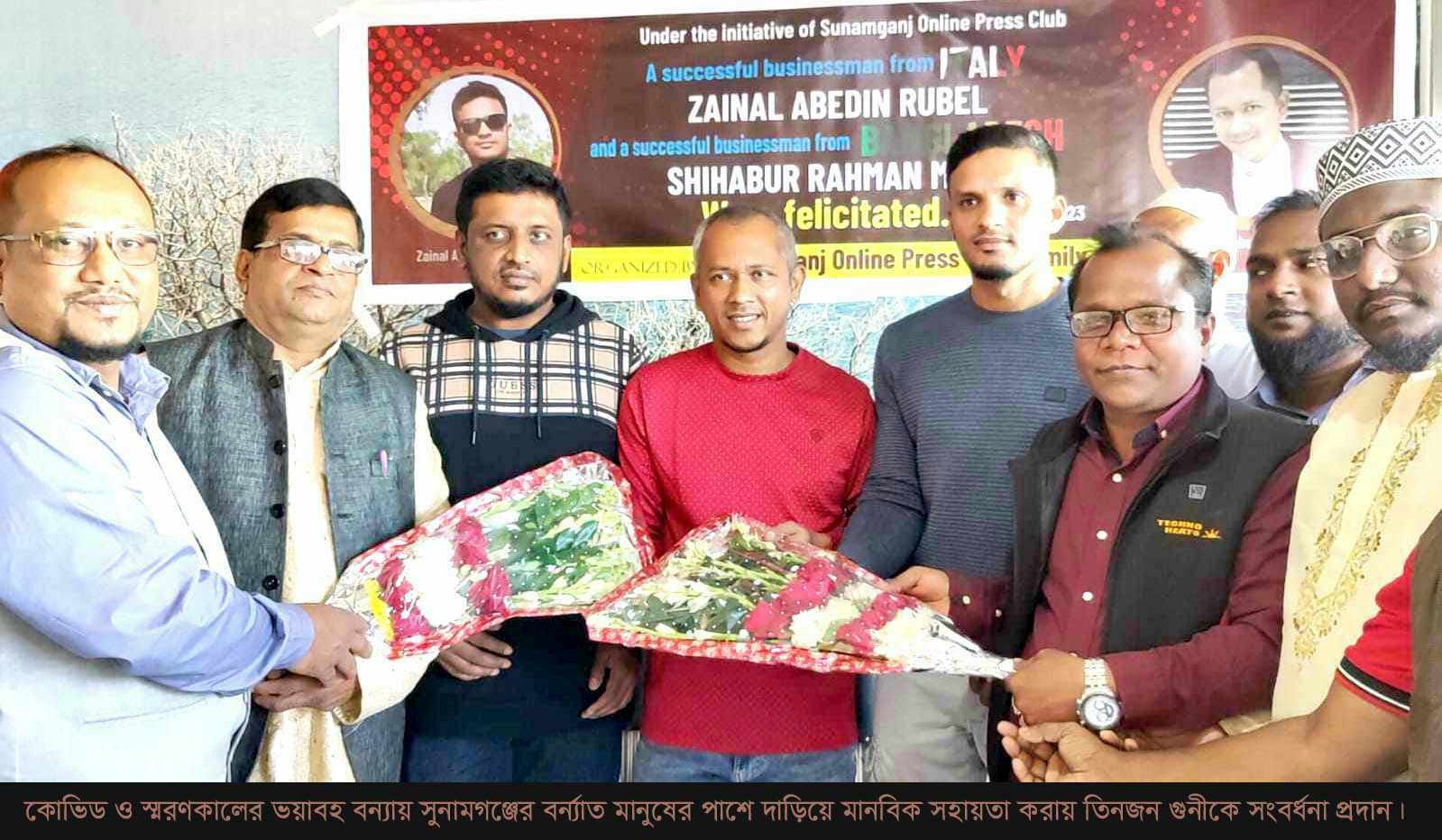 বন্যায় মানবিক অবদানের জন্য রুবেল ও মানিক কে সুনামগঞ্জে সংবর্ধনা