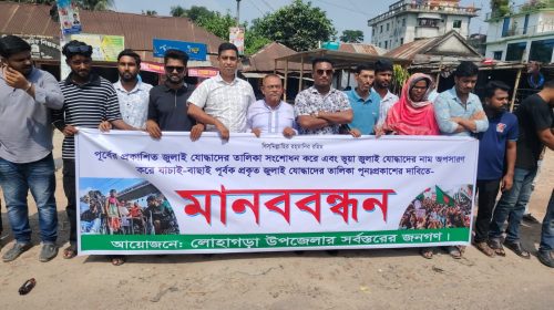 লোহাগড়ায় প্রকৃত জুলাই যোদ্ধাদের তালিকা অন্তর্ভুক্তির দাবিতে মানববন্ধন ও স্মারকলিপি পেশ।