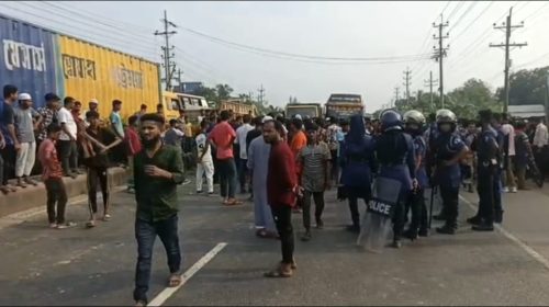 ভালুকায় বকেয়া বেতনের দাবিতে মহাসড়ক অবরোধ করে বিক্ষোভ।